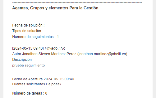 - Agentes, grupos y elementos para la gestión (esto está diligenciado cuando nuestro caso se encuentre en un estado Asignado, donde nuestro equipo de soporte estará solicitando información adicional o nos indicarán avances sobre nuestro caso).